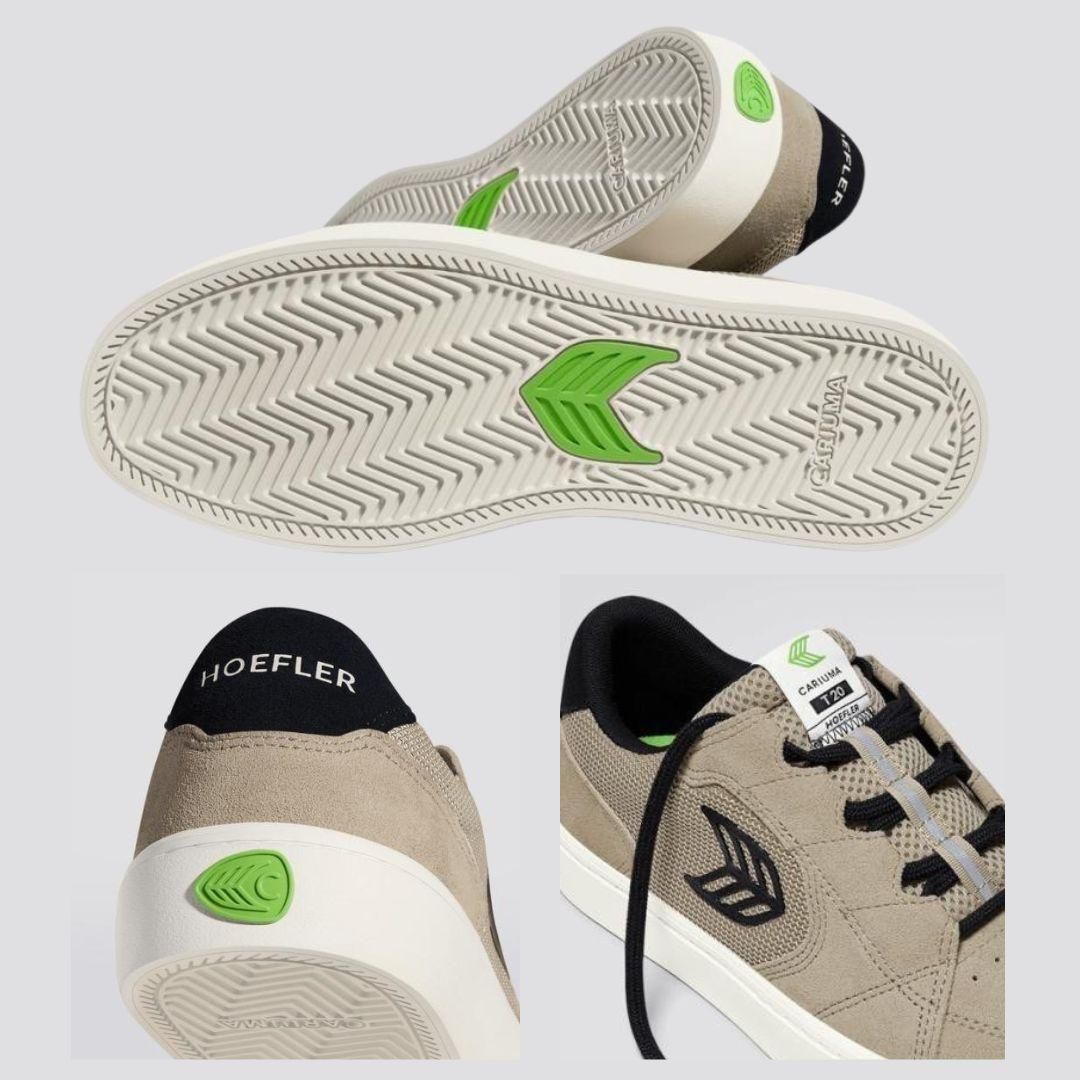二重のゴムと補強を施した耐久性の高いソール、LWG認定スエード、リサイクルメッシュのライニング、そしてバイオベースフォーム+コルクのインソール。